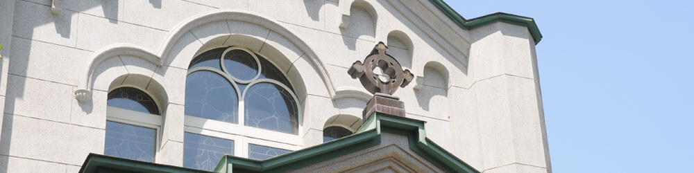1985年に英国トゥルーロ教区にあるエピファニー修道院から、百年余り前に造られた美しいステンドグラスの寄贈を受けました。 なかでも聖堂二階正面の「聖家族」の輝きは、日中は太陽の光を受け礼拝堂内に、夜は内側からの照明によって道行く人々に教会の存在を語りかけています。
